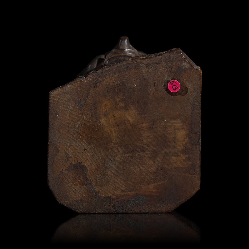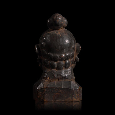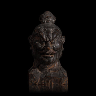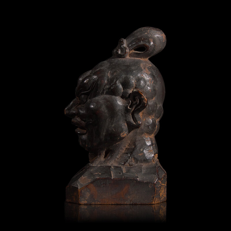 Carved with great attention to the rippling forms of flesh and muscle, the fierce visage, turned slightly to the side, with bulging eyes and open mouth, with rich glossy surface, somewhat crusty black patina with traces of orange-brown encrustation.