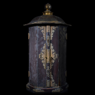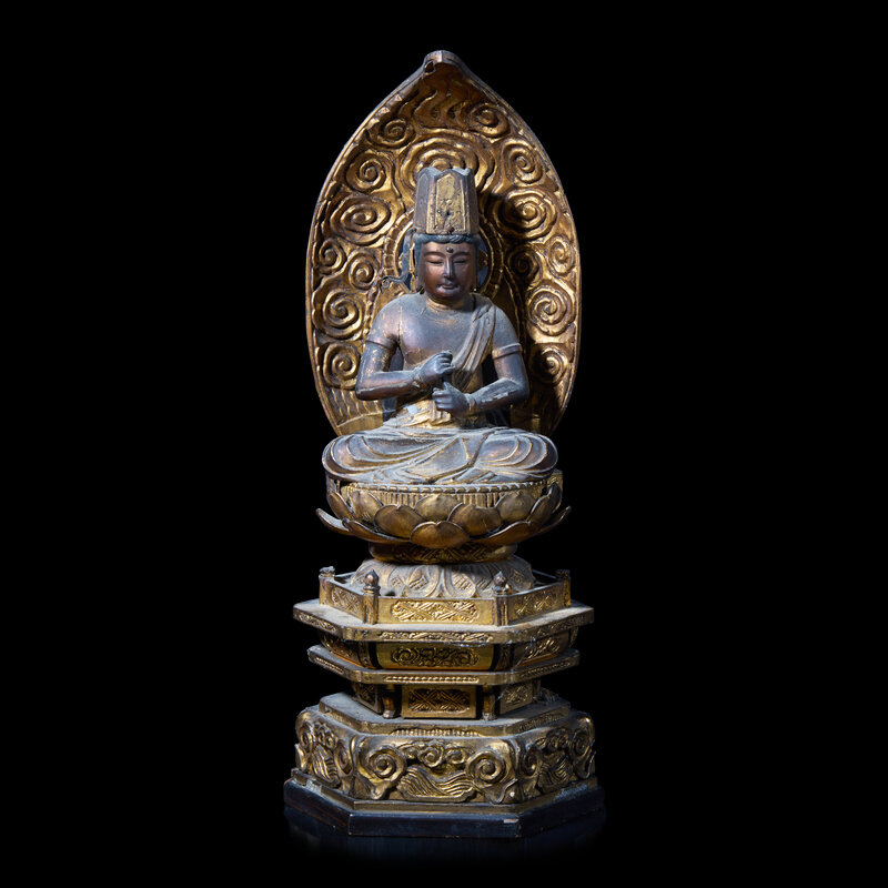 The hexagonal shrine with engraved gilt metal mounts, gilt lacquer interior, enclosing a figure of Dainichi Nyorai seated on a stepped lotus throne, his hands in the "wisdom-fist" mudra.
