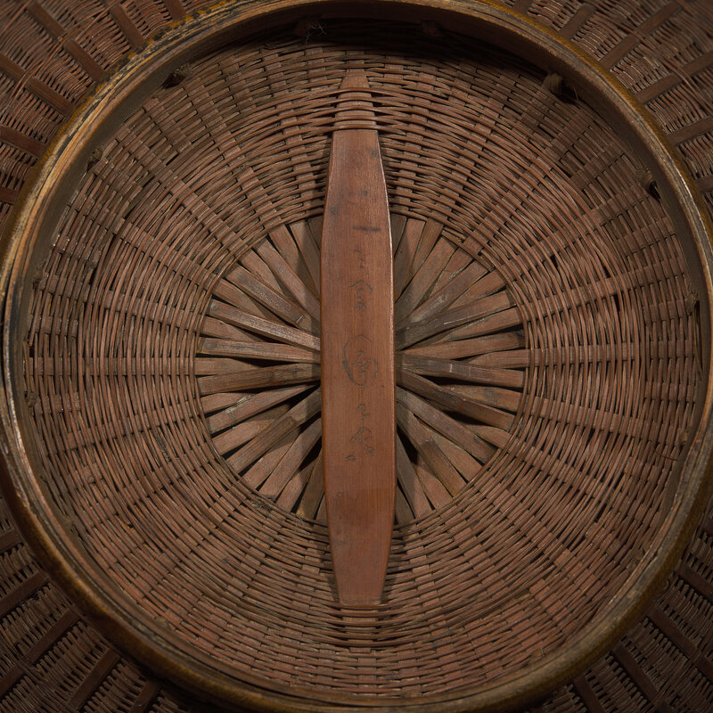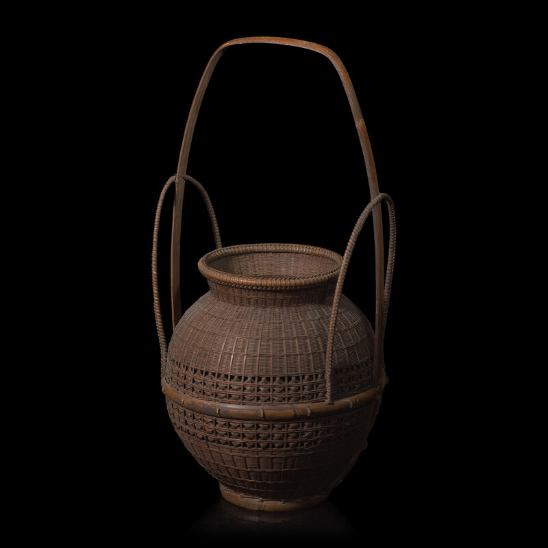Bamboo ikebana basket, the ovoid body rising to a flared mouth, a pair of upright handles flanking a longer overhanging handle.