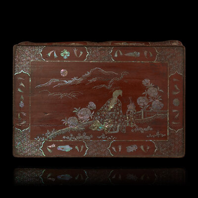 The rectangular top panel decorated in mother-of-pearl showing a seated scholar in a fenced garden with mountains in distance, border by various shaped cartouche against a diaper ground, above a short and recessed waist decorated with open worked windows, the shaped aprons also decorated with mother-of-pearl inlays showing ho-ho birds, all raised on s-shaped legs joined by a rectangular stretcher.