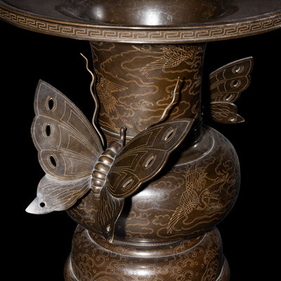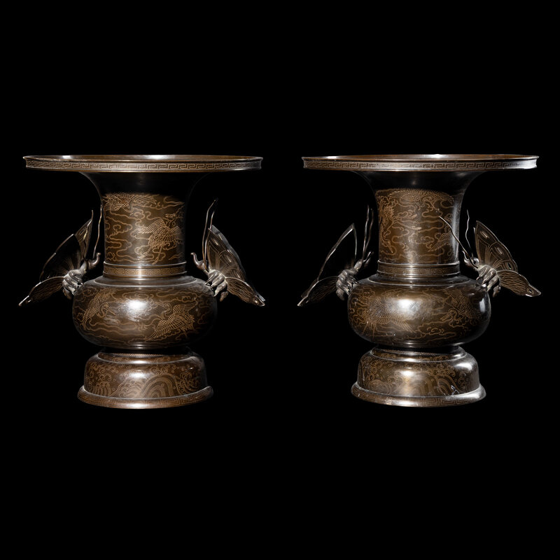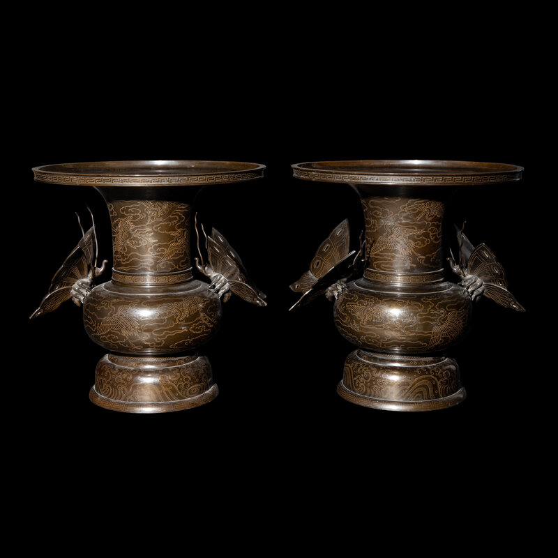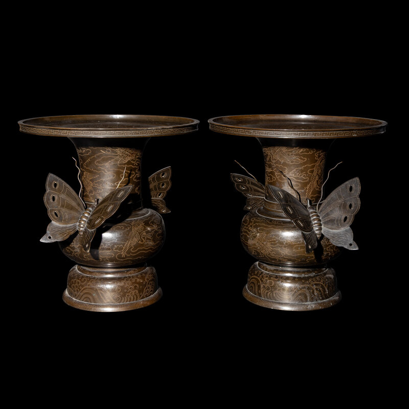 A Pair of Japanese Inlaid Bronze 'Butterfly' Vases, Late Edo/Early Meiji Period