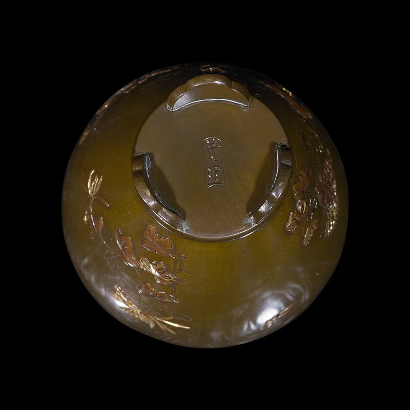 The exterior embellished with chrysanthemum and butterfly, the reticulated cover with matching decoration, the underside with signature "Inoue"