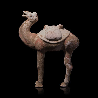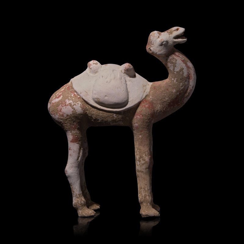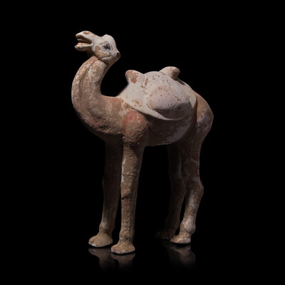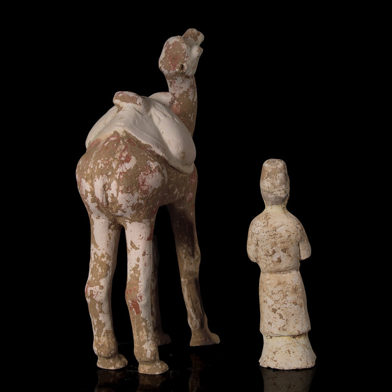 A Chinese Painted Pottery Figure of a Camel and A Pottery Figure of an Attendant, Tang Dynasty