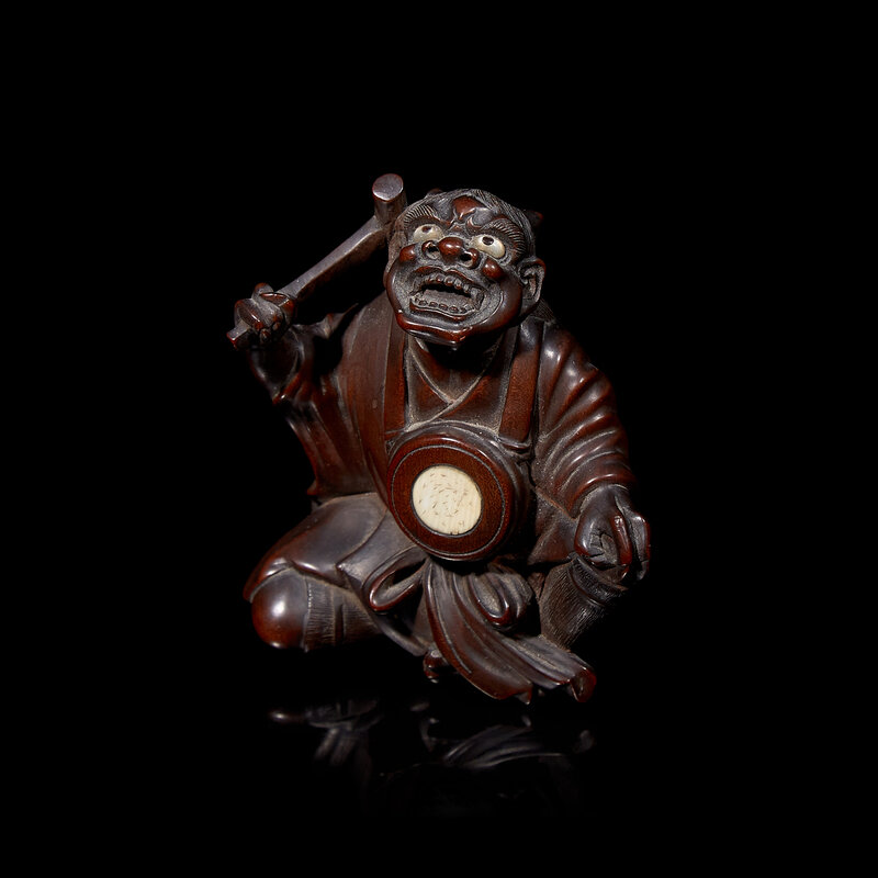 Finely carved, the seated oni with inset mother-of-pearl eyes, looking up with open mouth, a mallet in one hand, a small drum at his chest suspended from a strap around his neck, unsigned.