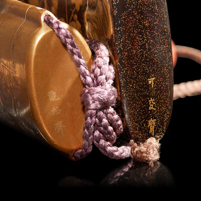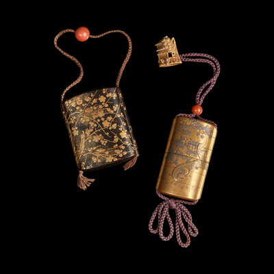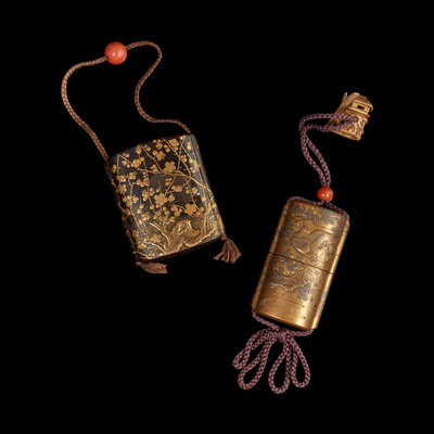 The first decorated with flowering prunus against a full moon, signed Kakosai, coral ojime; The second depicting a pair of peacocks among flowering branches, with irridescent shell inlaid "eyes", signed Kanshosai, stags horn netsuke carved as a two-tiered pavilion.
