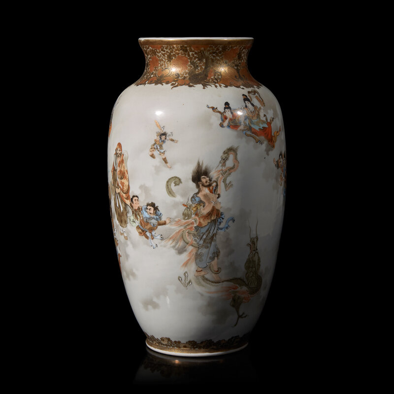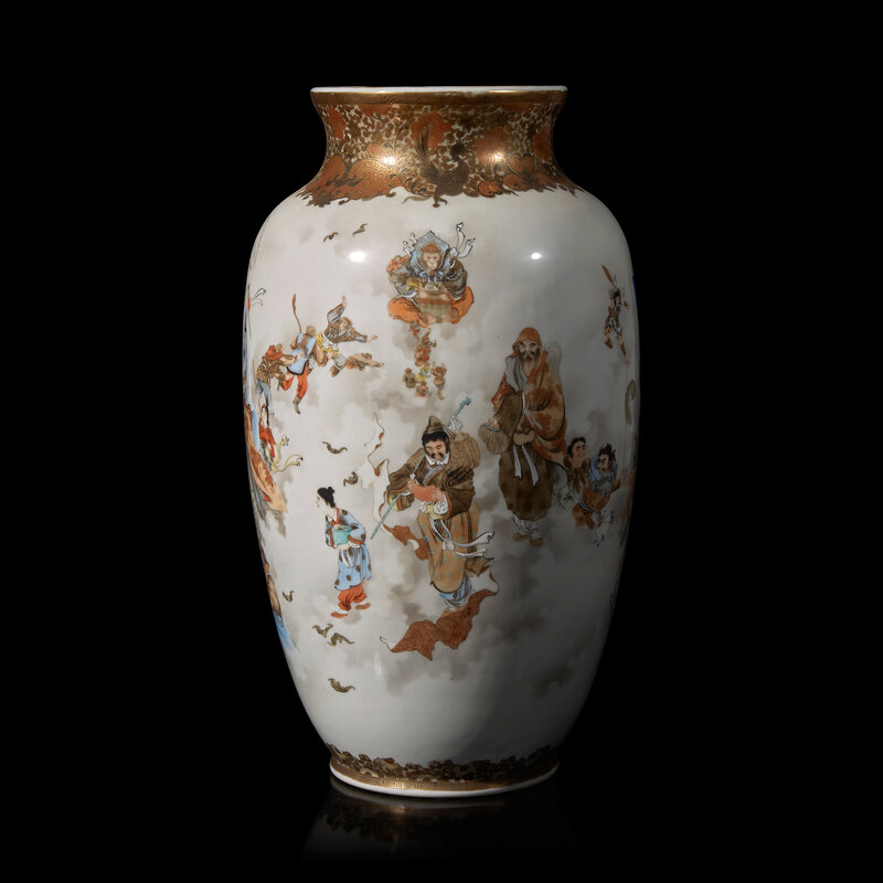 Depicting dramatic groups of immortals and mythical figures, including the Dragon King, Monkey and Kannon, with gilt and overglaze paintings.