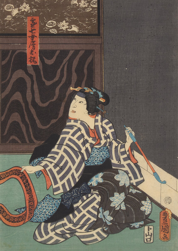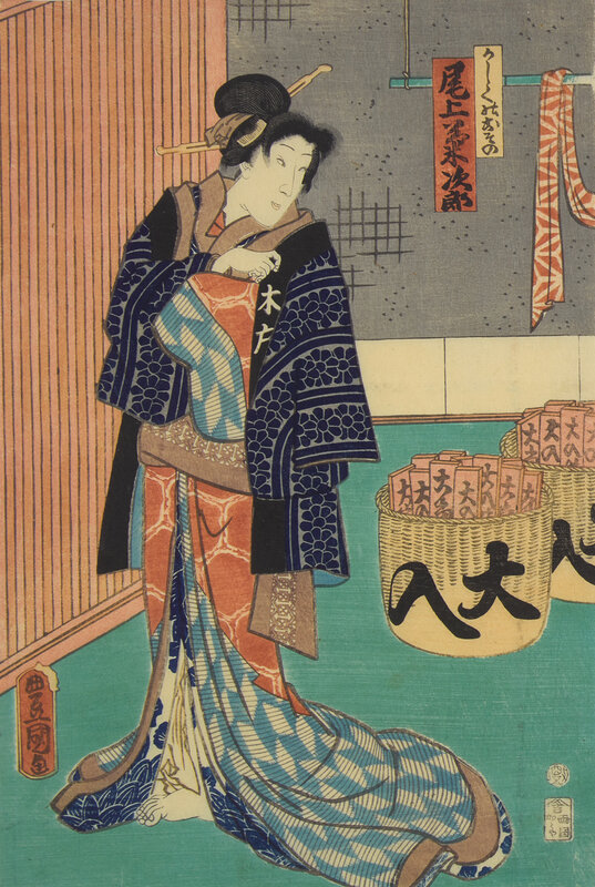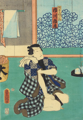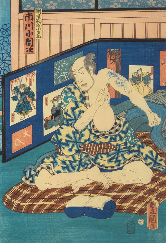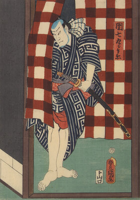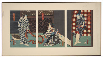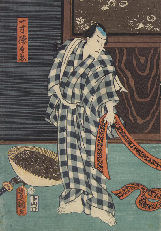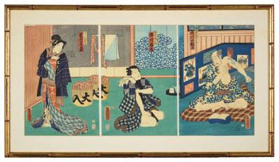 The first depicting the characters Danshichi Kurobei, his wife Okaji and Issun Tokubei, 1859; the second depicting a scene where the actor Ichikawa Kodanji reveals a tattoo, 1861. Framed, matted and glazed.