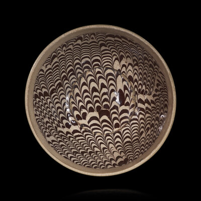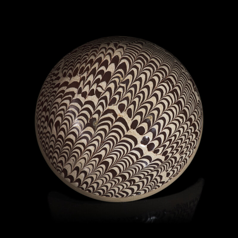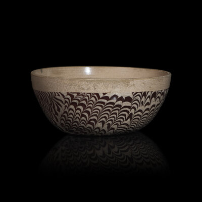 The rounded sides rising from the flat base, covered in a marbleized dark brown and creamy white glaze.