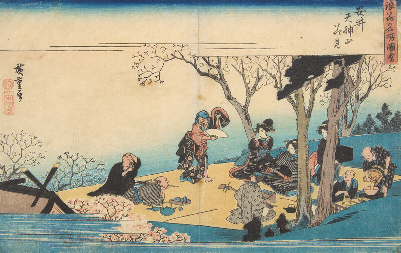 -Cherry Blossom Viewing on the Hill of the Tenjin Shrine, Yasui, from Famous Views of Osaka; framed, matted and glazed