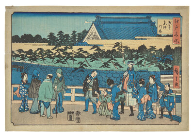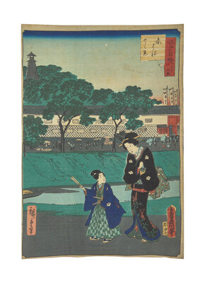 Woodblocks printed in colors, unframed, comprising: Higashi Hongan-Ji Temple at Asakusa From the series Famous Places in Edo, The Fire Tower at Akabane, from the series Thirty-Six Views of the Pride of Edo