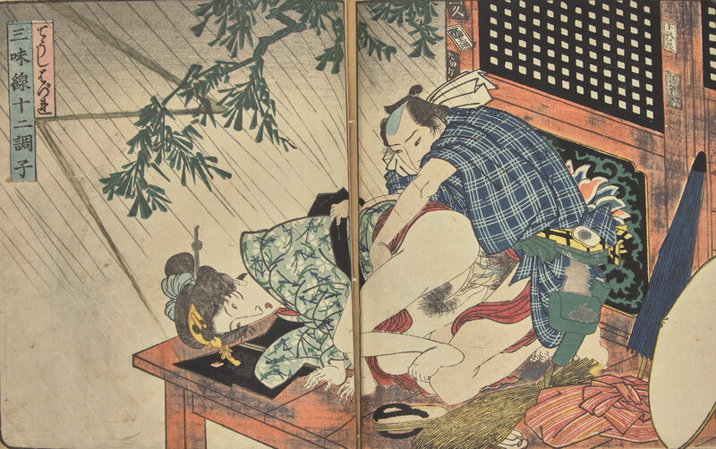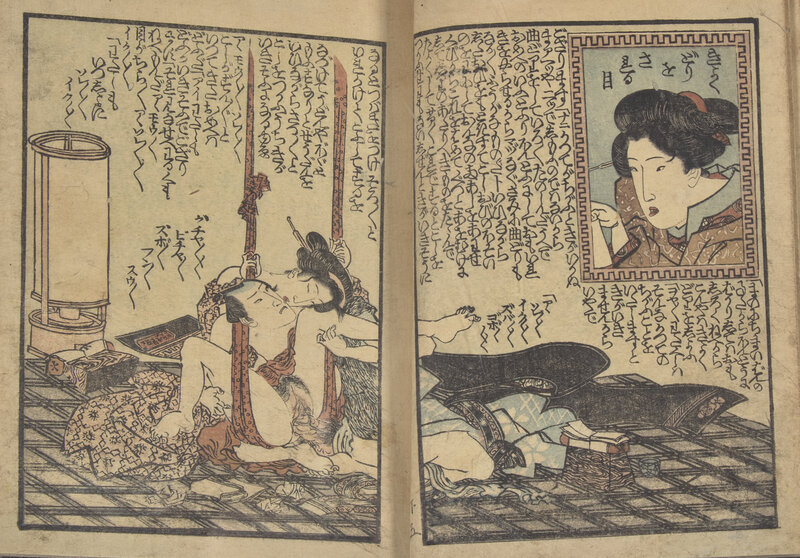 -Manpuki Wagogin (The Gods of Myrid Conjugal Delights), leporello album with silk cover, one single illustration of toys and a frontispiece; nine bifold illustrations