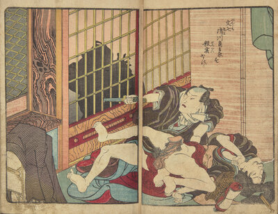 -Atributed to Utagawa Kunisada (Toyokuni III)(1786-1865), Two volumes with 45 pages of text, a frontispiece and twelve bifolds illustrating lovers, yellow paper covers