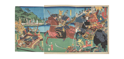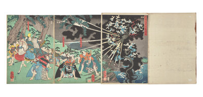 Unframed, in paper sleeves, the Yoshitora depicting a battle by a bay, 1856; the Yoshikazu depicting Minamoto no Mitsunaka Sumiyoshi Sanro Mojigen (Apparition of the Thunder God at Sumiyoshi Shrine Before Minamoto no Mitsunaka)