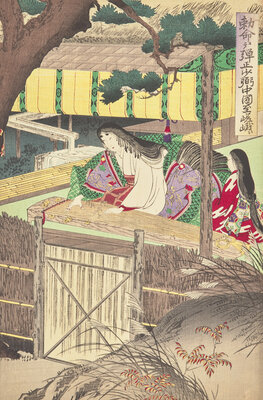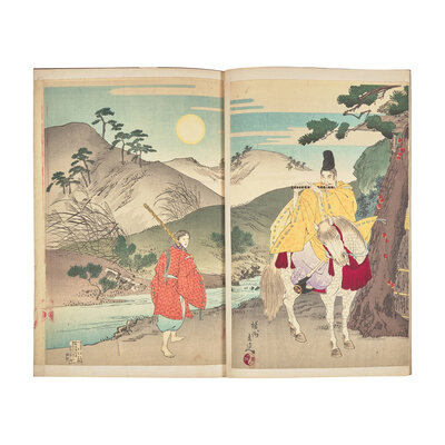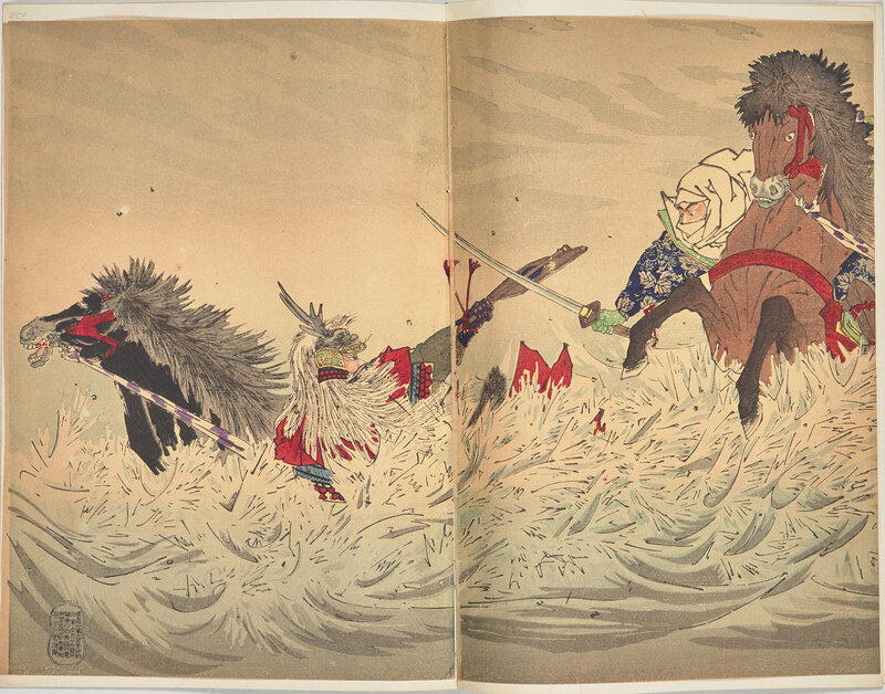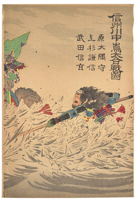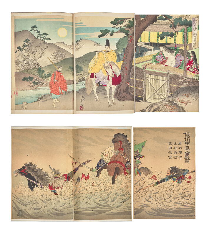Unframed, mounted in album format, depicting an Episode from the Tale of Koga no Tsubone, 1891; the second, the Battle of Kawanakajima in Shinshu, Hara Okuma no Kami, Uesugi Kenshin, and Takeda Shingen.
