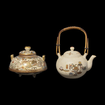 A Japanese Satsuma Type Enameled Pottery Miniature Kettle and a Koro, Meiji Period