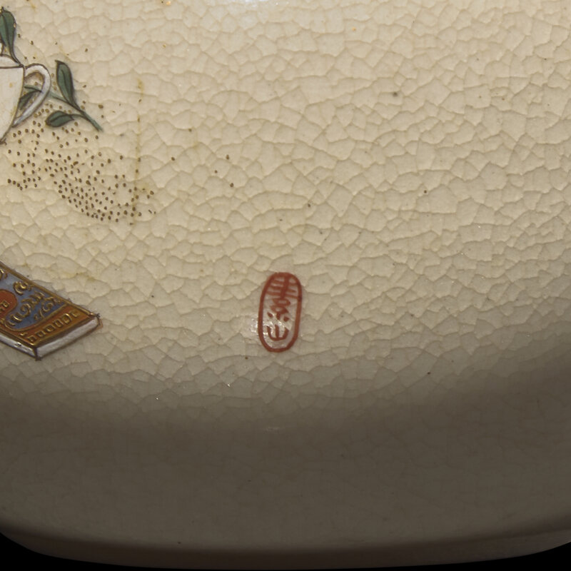 The koro and cover signed Kinkozan, decorated with figural and floral reserves against a brocade ground, above a wave and cherry blossom border; the kettle decorated with tea and poetry items, signed with a seal ...zan, the spout signed Kinkozan, Wicker handle.