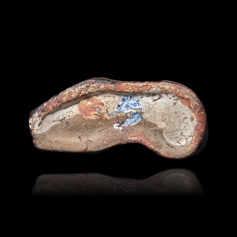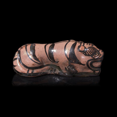The beast depicted in a recumbent posture with all four tucked underneath, the body painted with dark blue streaks on a light orange ground.
