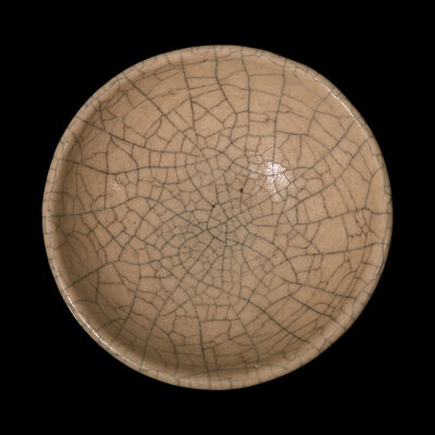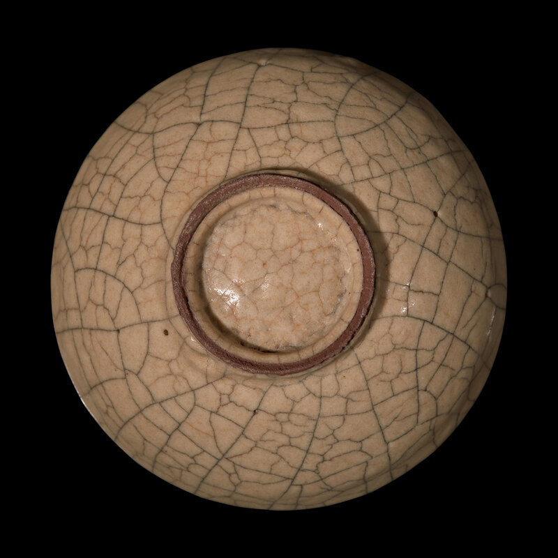 The sloping walls resting on a short foot, covered overall in a creamy white glaze suffused with a network of dark brown crackles.
