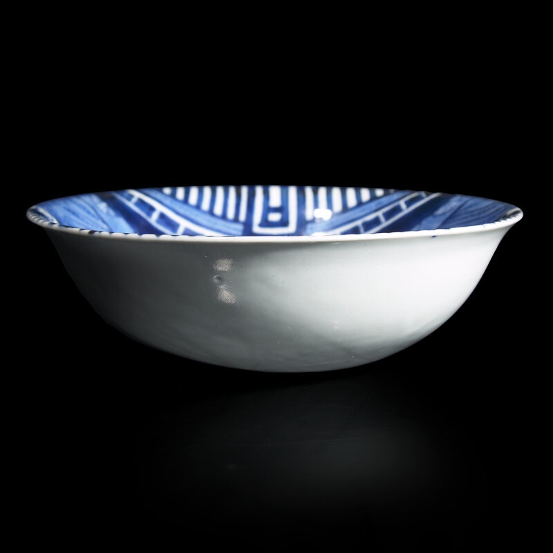 This unusual pattern is known in both Chinese and Japanese versions, dating primarily from the 17th to the 18th century. For a Tianqi version, see Becky MacGuire et al, Four Centuries of Blue and White, The Frelinghuysen Collection of Chinese and Japanese Export Porcelain, 2023, p. 302, no. 245, where related examples in the Metropolitan Museum of Art and the Seattle Art Museum are cited. See also a Japanese shaped dish in the Shibata collection, dated to circa 1720-1760, illustrated in The Kyushu Ceramic Museum, Complete Catalogue of the Shibata Collection, 2019, p. 390, no. 3111.