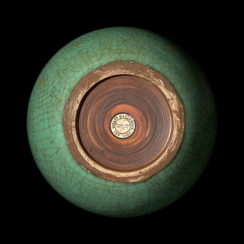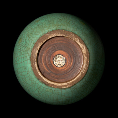 The globular body rising to an elongated, cylindrical neck, overall covered in a network of crackles, the exterior in an apple green glaze.