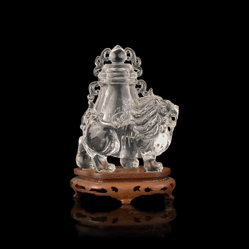 The quartz material carved as a striding beast, a covered vase on its back; scrolls flanking the final to cover, wood stand.