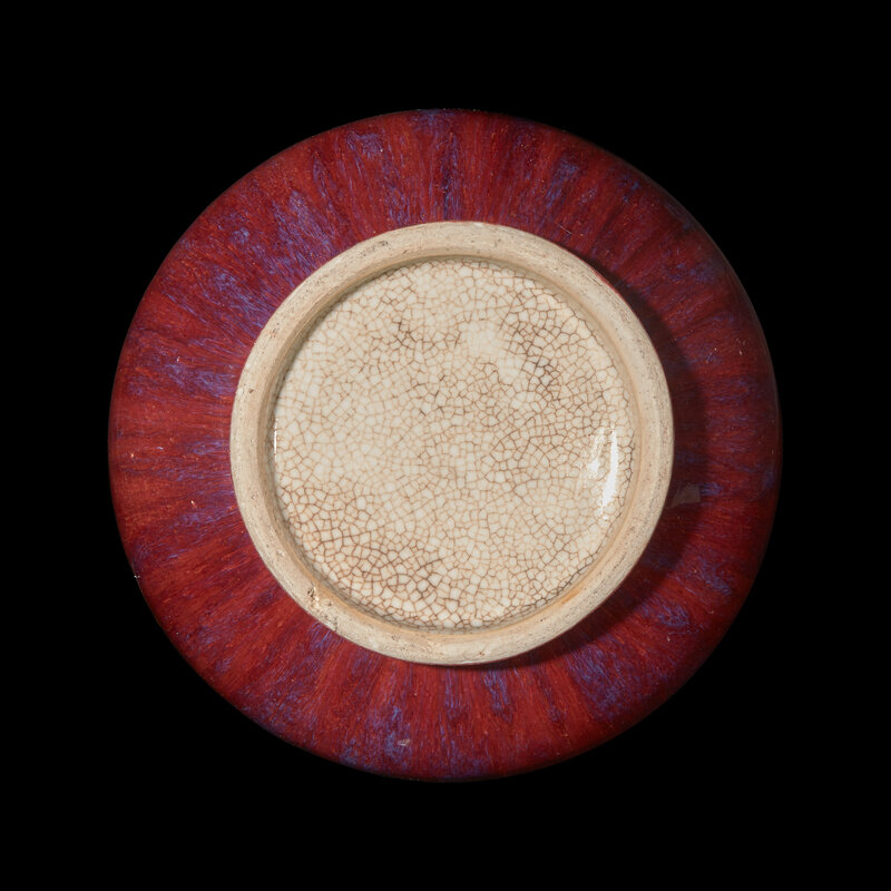 The pear-shaped body resting on a straight, circular foot, rising to an elongate neck, the exterior covered overall in a rich crushed raspberry glaze with purplish blue splashes, the underside in a crackled glaze.