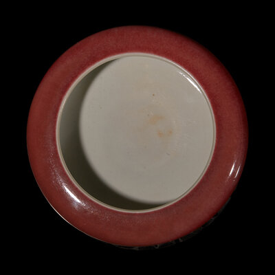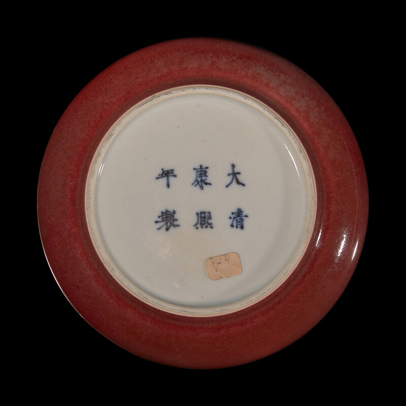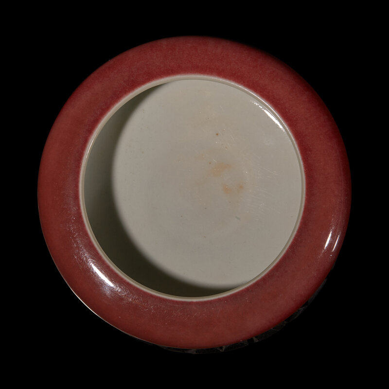 The compressed globular body resting on a short foot, the exterior covered in a strawberry-red glaze, the underside beraing an apocryphal Kangxi six-character mark in underglaze blue.
