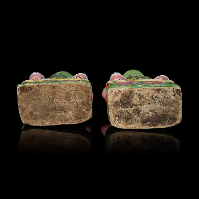 Each depicting a seated bearded foreigner in Chinese armor holding a lobed dish/candleholder on their head, all raised on rectangular pedestal.