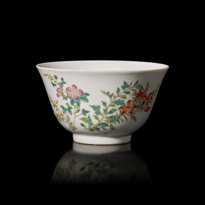 The sloping walls resting above a short straight foot, rising to a slightly flared mouth, the exterior painted with flowering branches, the underside bearing a Legutang zhi four-character iron red mark.