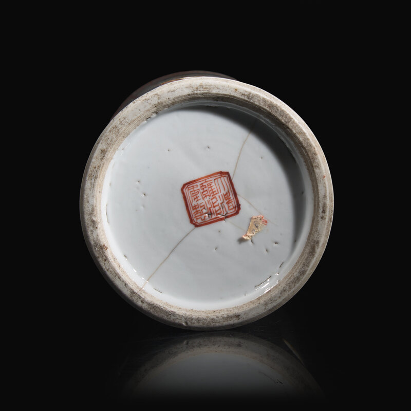 The cylindrical stand decorated with bats and stylized "Shou" characters, the underside with apocryphal Yongzheng six-character mark.