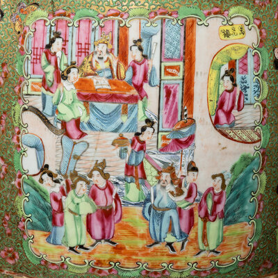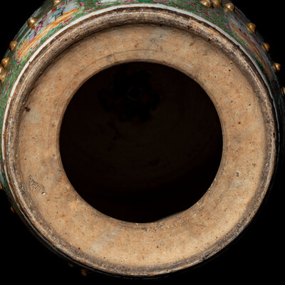 Each of barrel form, painted with figures in shaped panels, all between floral bands and raised gilt bosses, the sides and the top pierced with cash motifs.