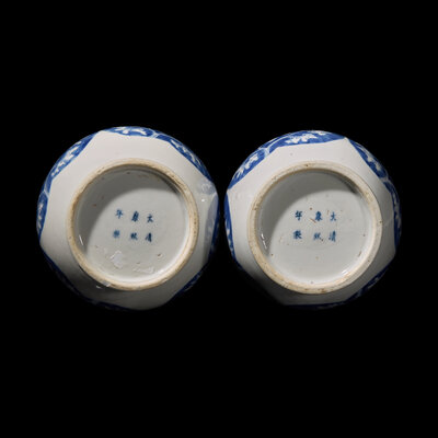 Both decorated with floral and cloud scroll type motifs, with six-character Kangxi mark to the underside.