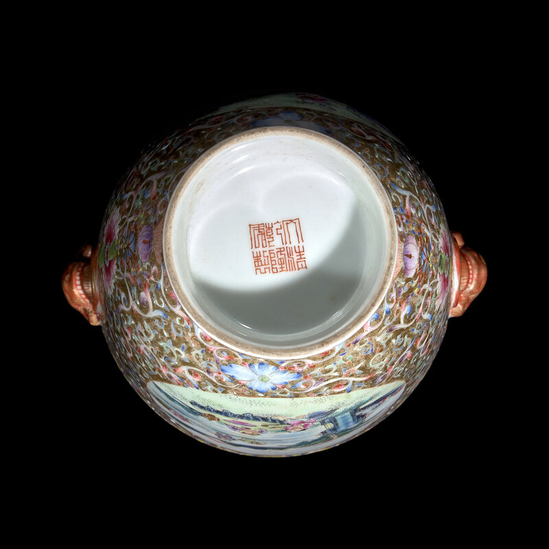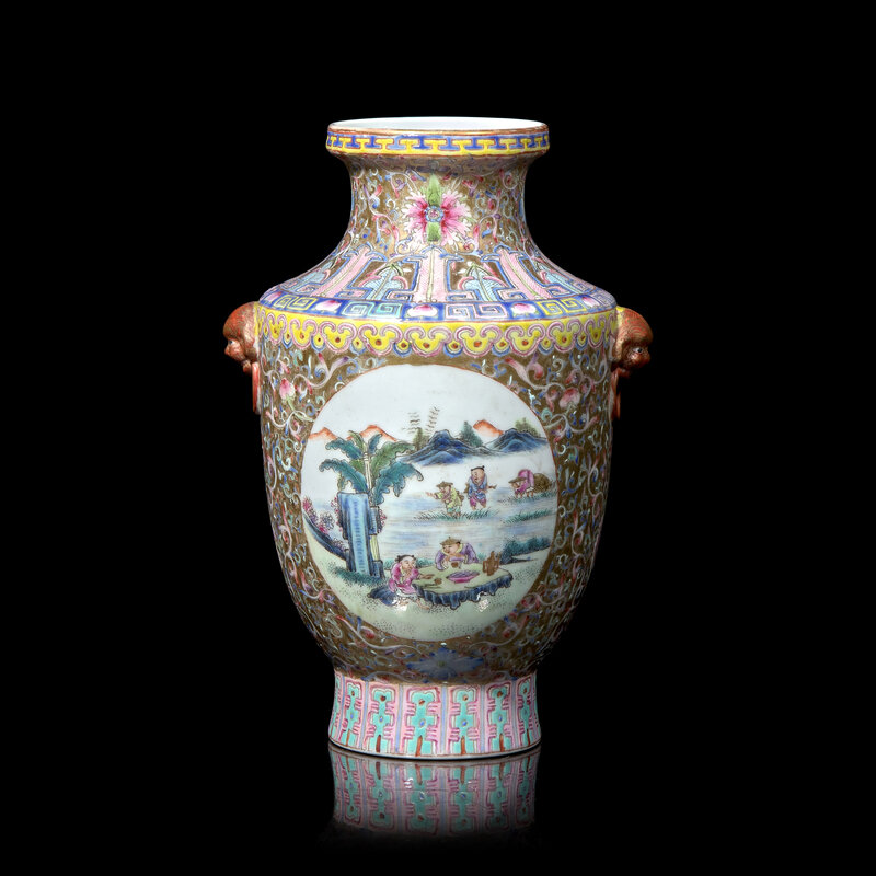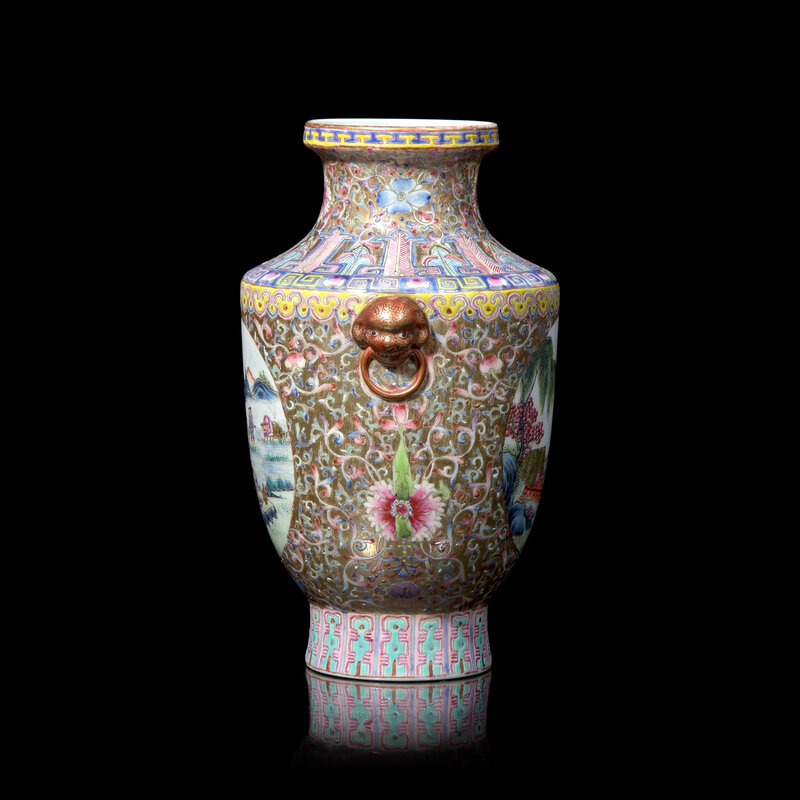 Vasiform, on a tall splayed foot, decorated with two medallion reserves depicting figures in landscapes, lion mask handles at the shoulder, all against a gold ground with dense lotus scrolls, elaborate stylized lappets at the shoulder and foot, underside with apocryphal six-character Qianlong seal mark.