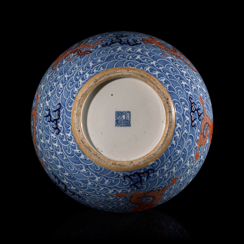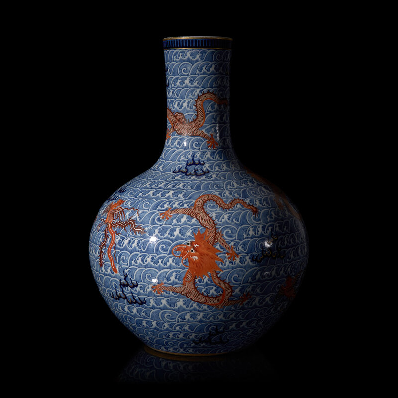 The large tianqiuping vase decorated with five dragons and phoenix amidst waves and flaming pearls, the underside bears a Qianlong mark.