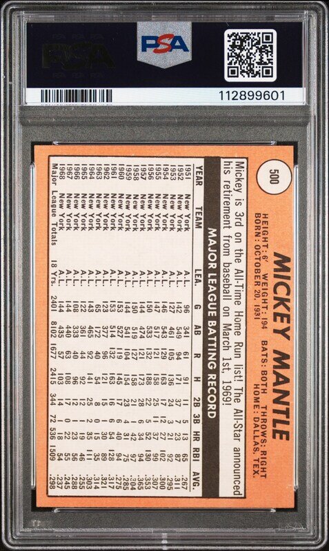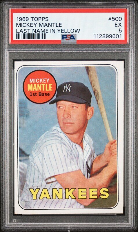 A 1969 Topps Mickey Mantle Baseball Card No. 500 - MANTLE LAST NAME IN YELLOW (PSA 5 EX)