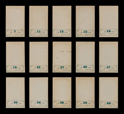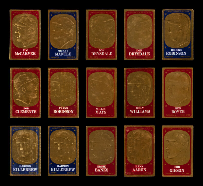 1965 Topps Embossed: Mickey Mantle, Harmon Killebrew (x2), Brooks Robinson, Tim McCarver, Don Drysdale (x2), Ken Boyer, Billy Williams, Frank Robinson, Roberto Clemente, Ernie Banks, Willie Mays, Hank Aaron, Bob Gibson.