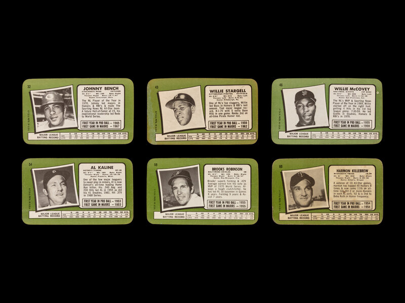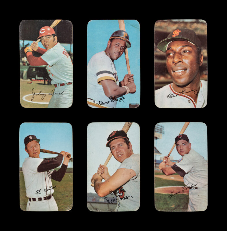 1971 Topps Supers: Willie Mays, Willie Stargell, Harmon Killebrew, Brooks Robinson, Willie McCovey, Al Kaline, Johnny Bench.