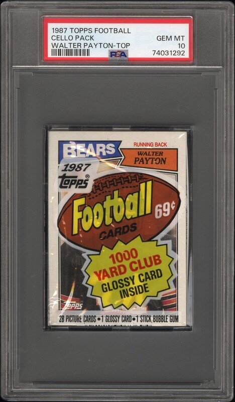 An Unopened Cello Pack of 1988 Topps Football Cards With Walter Payton On Top (PSA 10 GEM MINT)