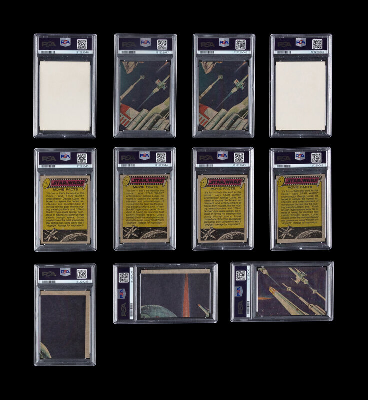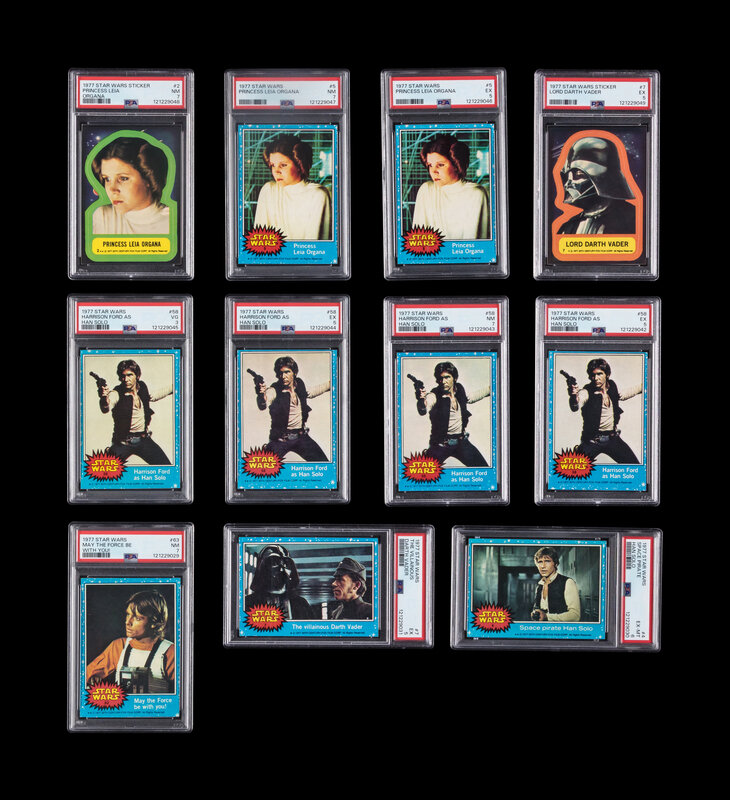 comprising No. 4 Space Pirate Han Solo (PSA 6 EX-MT); No. 5 Princess Leia Organa (PSA 7 NM, PSA 5 EX); No. 7 The Villainous Darth Vader (PSA 5 EX); No. 63 May The Force Be With You! (PSA 7 NM); No. 58 Harrison Ford as Han Solo (PSA 7 NM, PSA 5 EX x2, PSA 3 VG). Stickers: No. 2 Princess Leia Organa (PSA 7 NM); No. 7 Lord Darth Vader (PSA 5 EX).