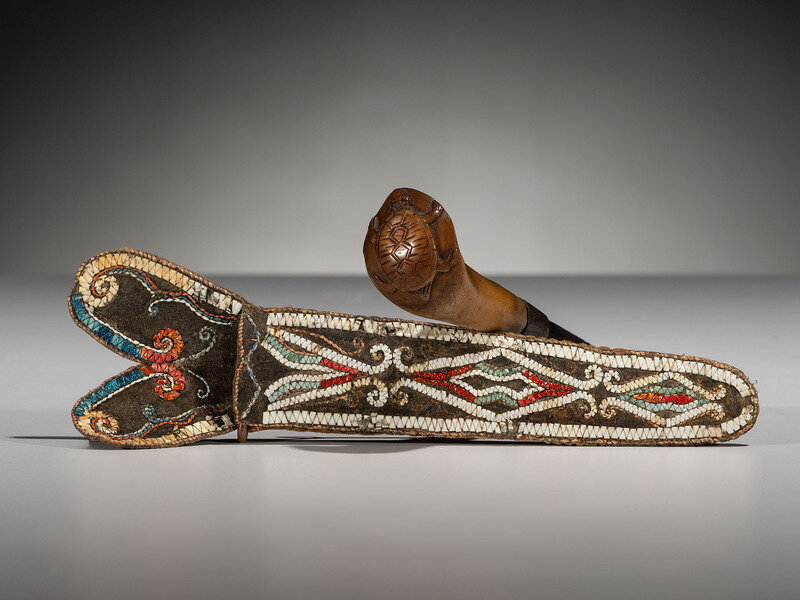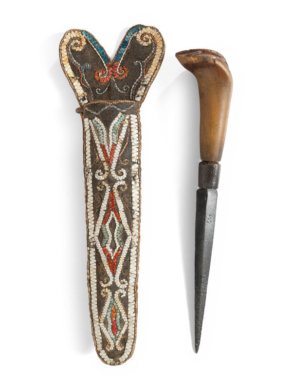 sinew-sewn and quilled with double-curve motif; horn-handled knife carved with a turtle effigy