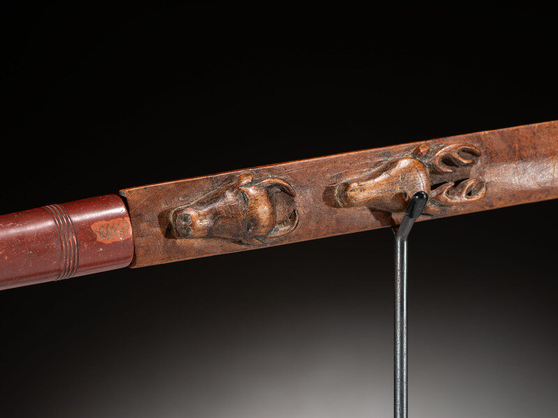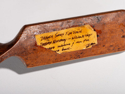 twisted wood stem carved with an elk and a bison; old, pasted label reads: Dakota Sioux Pipe Stem / Dakota Territory - William D. Hoyt(?) and with inked collection number #7188 / FRESXY; T-shaped catlinite bowl carved with concentric rings