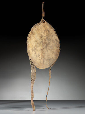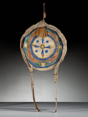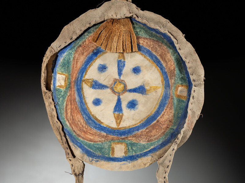 diminutive size; thin parfleche painted in blue, green, red, and yellow is surrounded by buffalo hide; old manuscript label: Arapaho, near Mud River, Wyom. 7.00