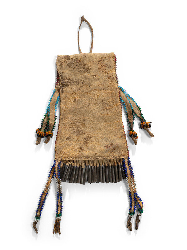 thread-sewn and beaded using colors of red white-heart, medium blue, translucent green, and white; tin cone fringe