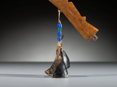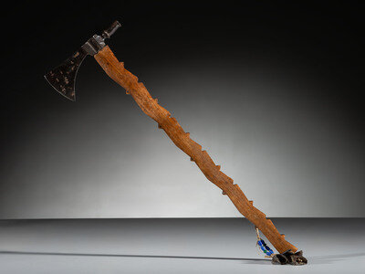 uniquely carved haft pierced through at four points for attachments; dew claw drops; steel head with sharply curved blade and narrow bowl