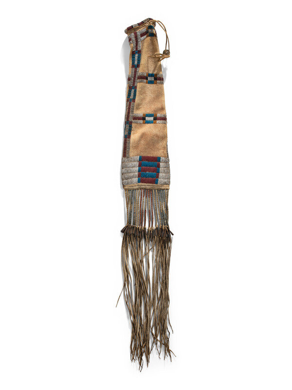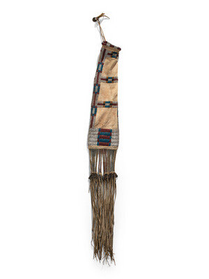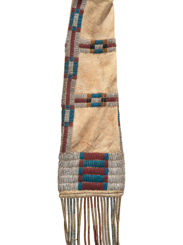 having a tapered form; sinew-sewn, softly tanned antelope hide beaded in white, rose, pumpkin, pony trader blue; quill-wrapped lower fringe embellished with tin cones