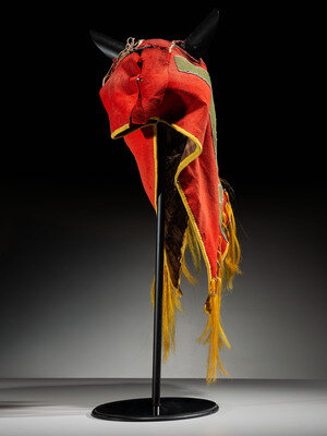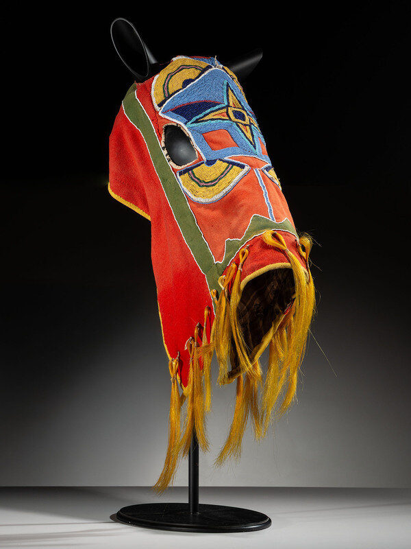 This is the mask worn by the horse of David Young Chief in a photograph taken by Lee Moorehouse, ca 1903 at the Pendleton Round Up Parade. Young Chief was the half-brother of Chief Joseph.