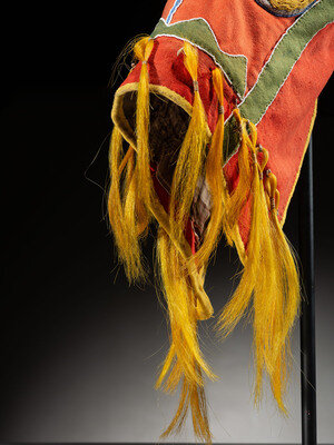 thread and sinew-sewn; red and green trade wool detailed with light and medium blue, red white-heart, greasy yellow, translucent green, pink and white glass beads; yellow-dyed horsehair fringe