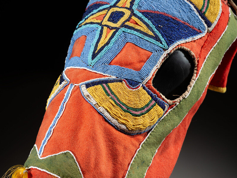 A complex beaded pattern featuring a four-point star on the forehead makes this a stunning mask... The Washat or Dreamer Religion was founded in the 1860s by a man called Smohalla. He was related to both the Sinkayuse and the Nez Perce; but Smohalla had wide influence across the Central Plateau in the second half of the 19th century. The North Star and crescent moon were primary symbols of this visionary belief. Smohalla designed his own flag. This banner was yellow, representing the dried grasses along the Columbia, bordered by strips of green, representing the moist hill tops. In 1884, Smohalla said: "This is my flag and it represents the world... There are four [directions] in the world... I have been all those ways. This is the center. I live here... The star is the North Star. That star never changes; it is always in the same place. I keep my heart on that star. I never change." Mooney 1896: 725-26). In the brilliant composition of the artist's design seen here, the same concepts are expressed (Cowdrey, Martin and Martin 2006: 88-89).