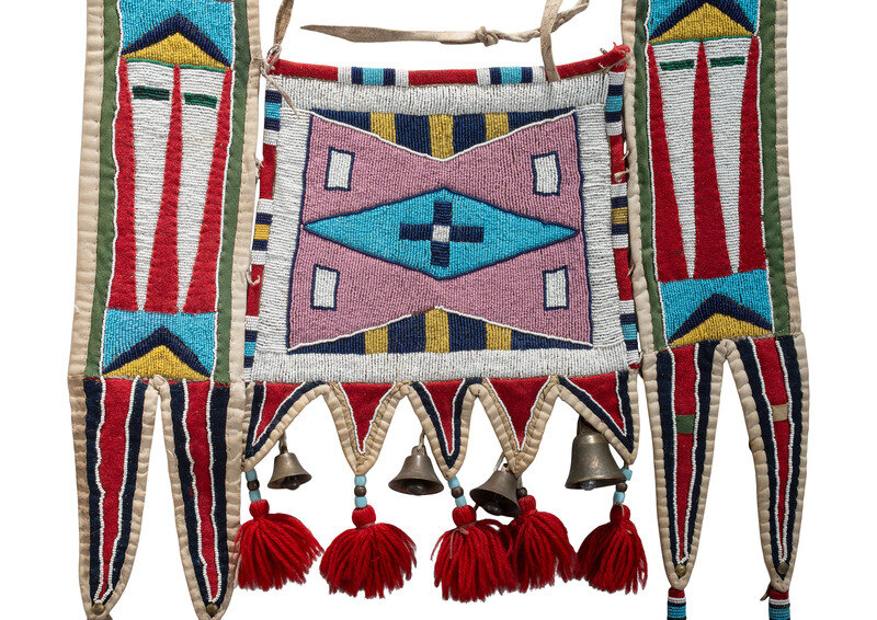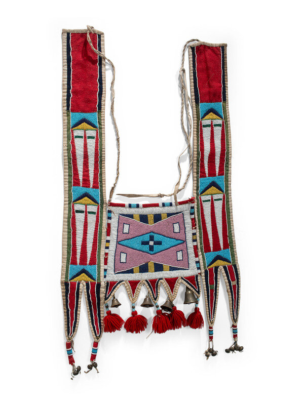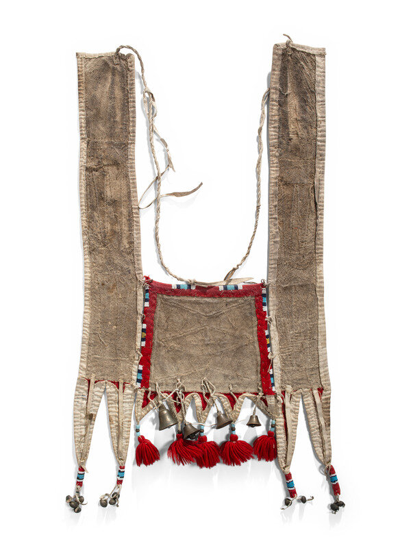 thread and sinew-sewn; hide panels are beaded with colors of light blue, pink, dark blue, greasy yellow, translucent green, and white; red trade will and green felt; large brass bells