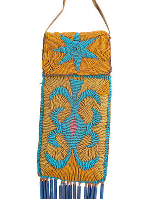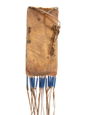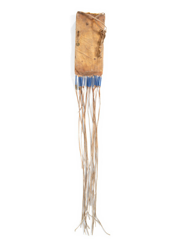 thread and sinew-sewn with real-sized beads in colors of light blue, orange, and red white-heart; parfleche lined; closing flap made of commercial leather; interior with remnants of a glass mirror